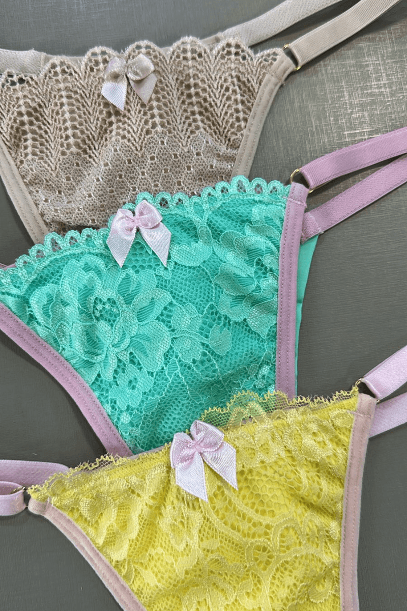 Esse kit acompanha 3 calcinhas em renda, fio duplo e com regulagem nas laterais: uma calcinha na amarela com rosa, uma calcinha rosa com verde e uma calcinha nude. Acompanha em uma embalagem personalizada exclusiva Segredo Lacrado e Sereia de Noronha.
