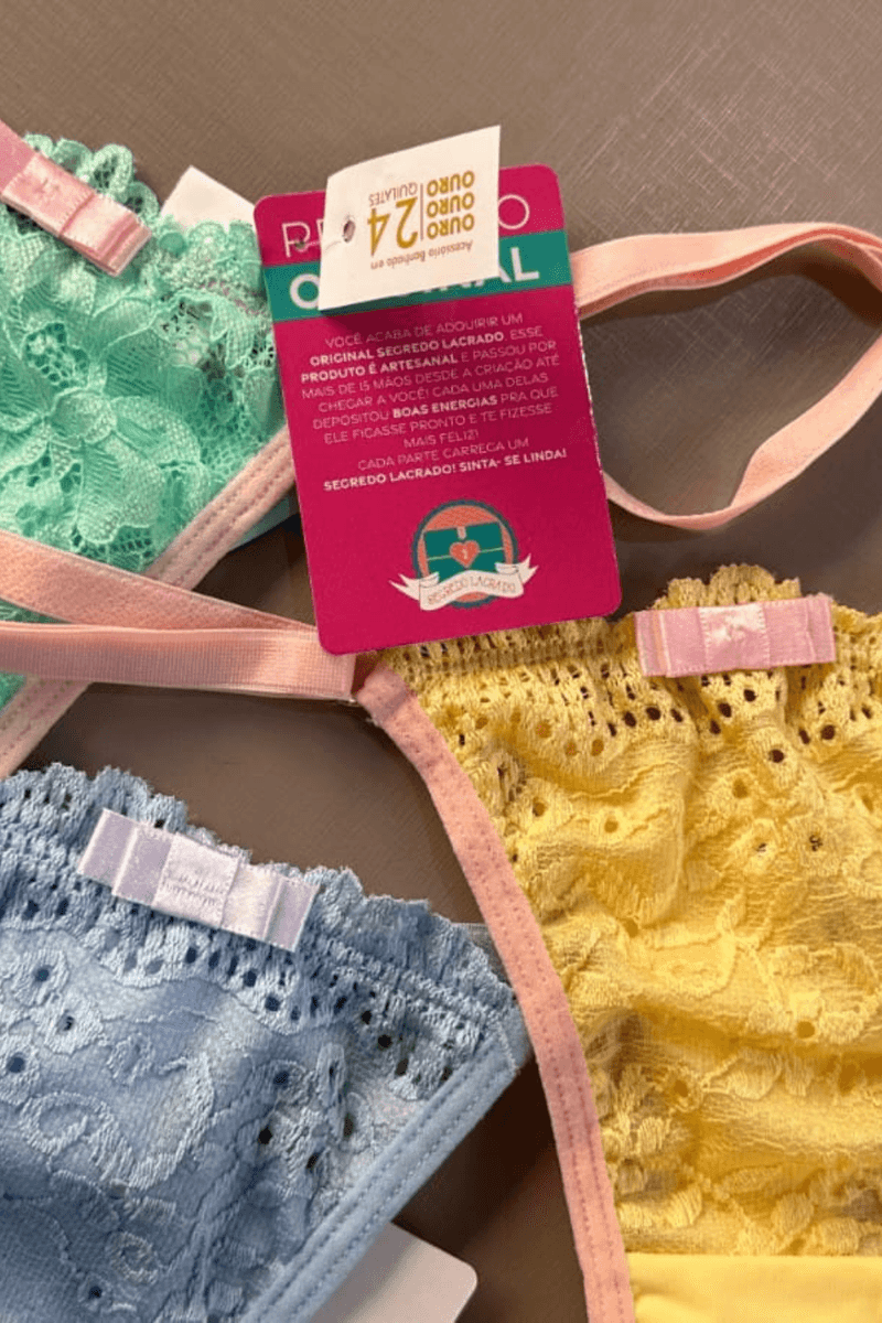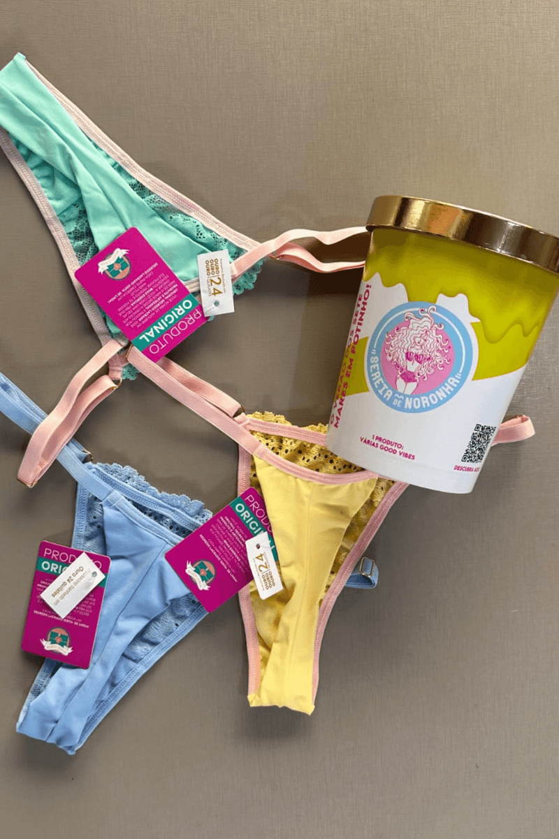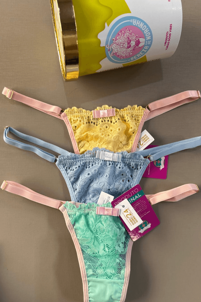 Esse kit acompanha 3 calcinhas em renda, fio duplo e com regulagem nas laterais: uma calcinha na amarela com rosa, uma calcinha rosa com verde e uma calcinha azul. Acompanha em uma embalagem personalizada exclusiva Segredo Lacrado e Sereia de Noronha.