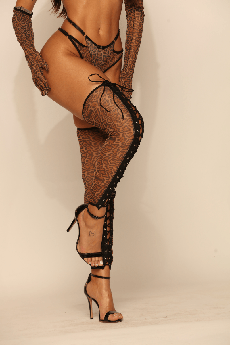 Um conjunto Segredo Lacrado contendo: 1 Sutiã meia taça com aro e sem bojo, uma calcinha semi fio, uma meia string 7/8 tamanho único, um par de luvas longa em tule tamanho único.